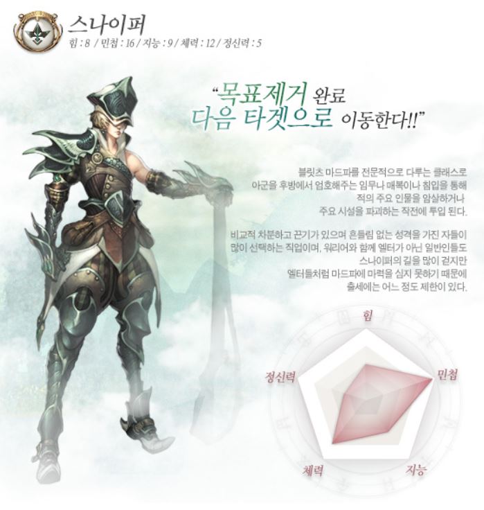 스나이퍼는 활을 사용하며 먼 거리에서 적을 저격하는 저격수입니다.
