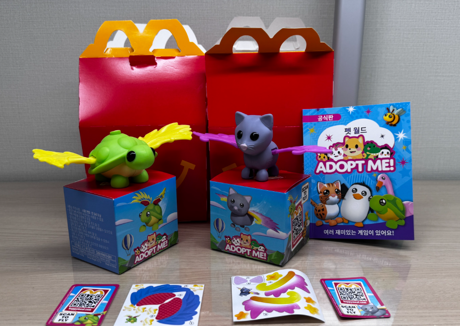 이번 11월, 맥도날드 해피밀 장난감이 로블록스 인기 게임 ‘입양하세요(Adopt Me)’의 펫 피규어로 구성되어 출시되었습니다. 실제 게임 속에서 ‘날 수 있는 펫(Flyable Pet)’으로 등장하는 캐릭터들이 피규어로 구현된 만큼, 로블록스 팬이라면 놓칠 수 없는 라인업입니다.