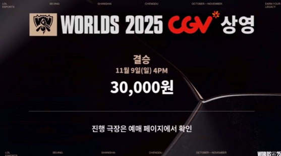 CGV 롤드컵 결승전 생중계 티켓은 일반 영화 예매가보다 높은 30,000원으로 책정되었습니다.