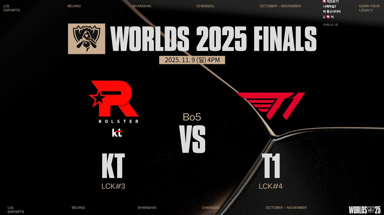 드디어 올 한 해를 장식할 2025 리그 오브 레전드 월드 챔피언십(롤드컵) 결승 대진이 T1 대 KT 롤스터로 최종 확정되었습니다.