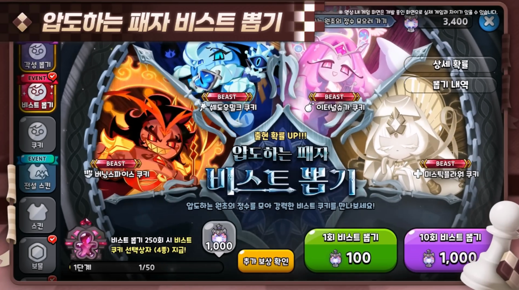 그랜드더스트 호텔 가장 깊은 곳에 나타난 네 명의 비스트 쿠키들을 상대로 도전하는 전투 콘텐츠입니다. 비정기적으로 운영될 예정이며, 쉐도우밀크, 이터널슈가, 버닝스파이스, 미스틱플라워 쿠키까지 총 네 개의 보스 스테이지가 등장합니다.