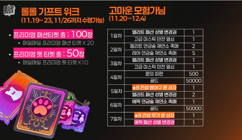 | 롤롤 기프트 위크 | 2025년 11월 19일부터 출석 시 지급 | 프리미엄 패션 티켓 100장, 펫 티켓 50장 |