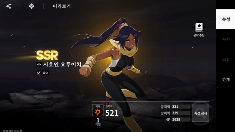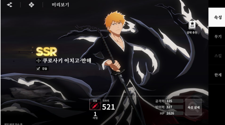 | S급 (천상계) | 쿠로사키 이치고 만해 | 한정 가챠 캐릭터. 필살기 '호로화' 사용 시 쿨타임 초기화, 무적 효과, 피해량 대폭 증가, HP 1 미만 방어 등 최상위 딜러 성능 발휘. |