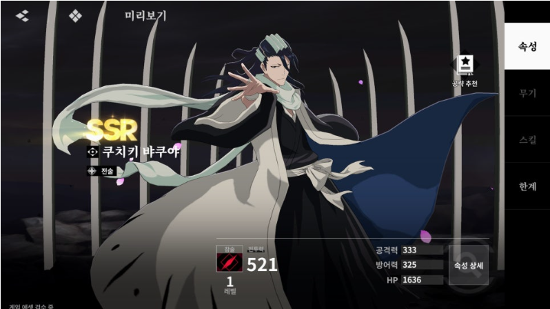 | 쿠치키 뱌쿠야 | 중거리 단일 적 대상 효과적인 딜러. 참술 저항 감소 및 순간 피해, 소대 강화에 강점을 가짐. | |