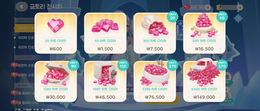 현질재화입니다 이벤트 수급, 하트다이아로 교환 가능하며 상점에 일부 아이템들 구매 및 뽑기가 가능합니다